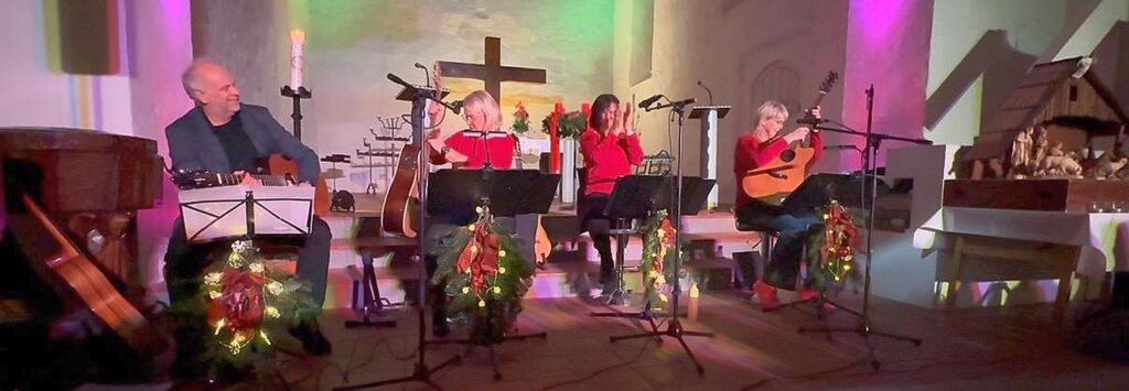 Live treten die drei selten auf, was man ihnen aber nicht anmerkte. Deshalb war es für Ingar Mikat (Quarnstedt), Ute Vollstedt (Rosdorf/beide Westerngitarre) und Ute Koopmann (Kellinghusen/Konzertgitarre), alle im Alter um die 60 Jahre, ihr erster Auftritt in diesem Jahr – und ein ganz besonderer. Eher wirkte es so, als hätten sie die letzten Monate im Proberaum verbracht, um jeden einzelnen Akkord zu proben. Ursprünglich wollten sie ganz „unplugged“ spielen, entschieden sich dann aber doch für akustische Verstärkung. Vermutlich, weil niemand Lust hatte, in der letzten Reihe nur noch das Rascheln der Wintermäntel zu hören.