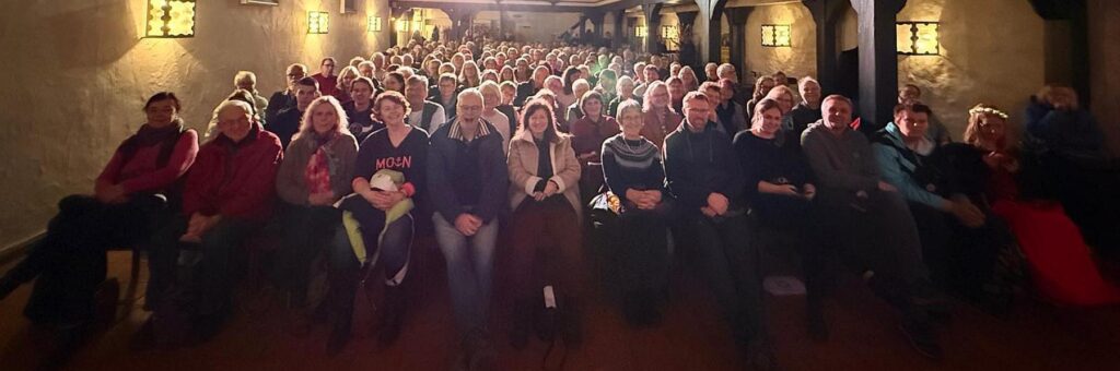 Akustisch saßen sie ebenerdig statt auf der Empore, weil der Sound dort wohl an der niedrigeren Decke hängen geblieben wäre. Ergebnis nun: toller Klang, aber eingeschränkte Sicht. Irgendwas ist ja immer. Einige Besucher sahen vermutlich mehr Hinterköpfe als Musikerinnen. Fürs nächste Mal wird nachgebessert, versprach Erk Böteführ. Dann: Empore ja, aber mit moderater Verstärker-Technik.