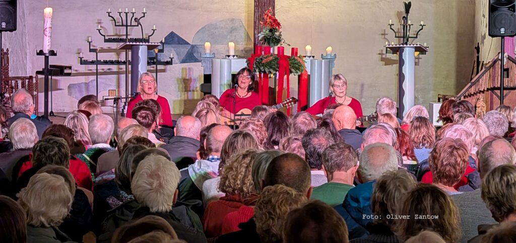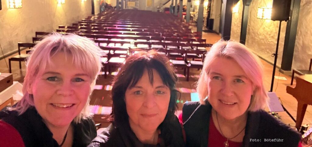 Obwohl es kurz vorher noch Restkarten gab, war die Kirche am Ende voll bis zur letzten Bankfuge. 200 Menschen auf Kirchenbänken, die sich dachten: „Weihnachtslieder? In der Kirche? Verrückt! Aber warum eigentlich nicht?“ Die drei Musikerinnen, alle um die 60, aber musikalisch fitter als mancher 20-Jährige im YouTube-Kurs, spielten 20 Songs in zwei Sets: auf Plattdeutsch, Hochdeutsch und Englisch, quasi ein wohl schmeckendes Weihnachtsbuffet für die Ohren.