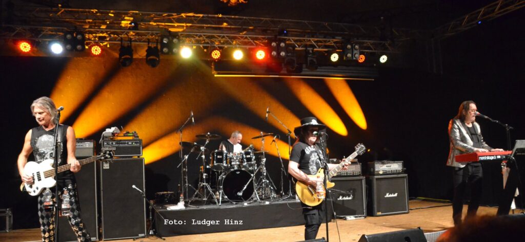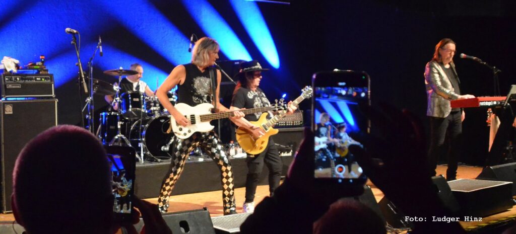 Zum Glück, damit der Abend nicht ganz so kurz wurde, gab’s vorher noch die Vorband „For Rock’s Sake“ aus Kiel, die den Laden schon mal auf Temperatur brachte. Besonders weil mit Gitarrist Bernd Pahlke der langjährige PEP-Techniker auf der Bühne stand. Anfangs etwas zäh, später dann mitreißend psychedelisch-rockig und laut genug, um die Halle zu entstauben. Das Publikum brauchte zwar ein paar Songs, um aufzutauen, feierte die Band am Ende aber wie einen Überraschungsbesuch vom Weihnachtsmann. Leider wurde ihr Set abrupt beendet; vermutlich, weil sie sonst länger gespielt hätten als die Hauptband.